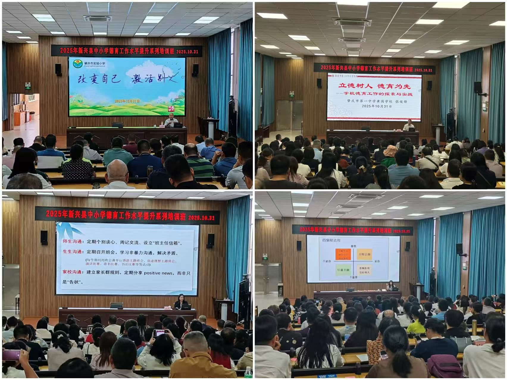 2025年10月31日,新兴县中小学德育工作水平提升系列培训班在新兴县教师发展中心成功举办。培训邀请肇庆市实验小学麦建华书记、肇庆市第一中学黄岗学校张俊锋书记等4位专家围绕学校领导班子建设、班级管理与文化建设、德育工作机制、教师心理调适等主题展开,覆盖全县中小学党组织书记、校长、德育干部及骨干班主任,有效提升了德育队伍的育人能力和心理健康素养。