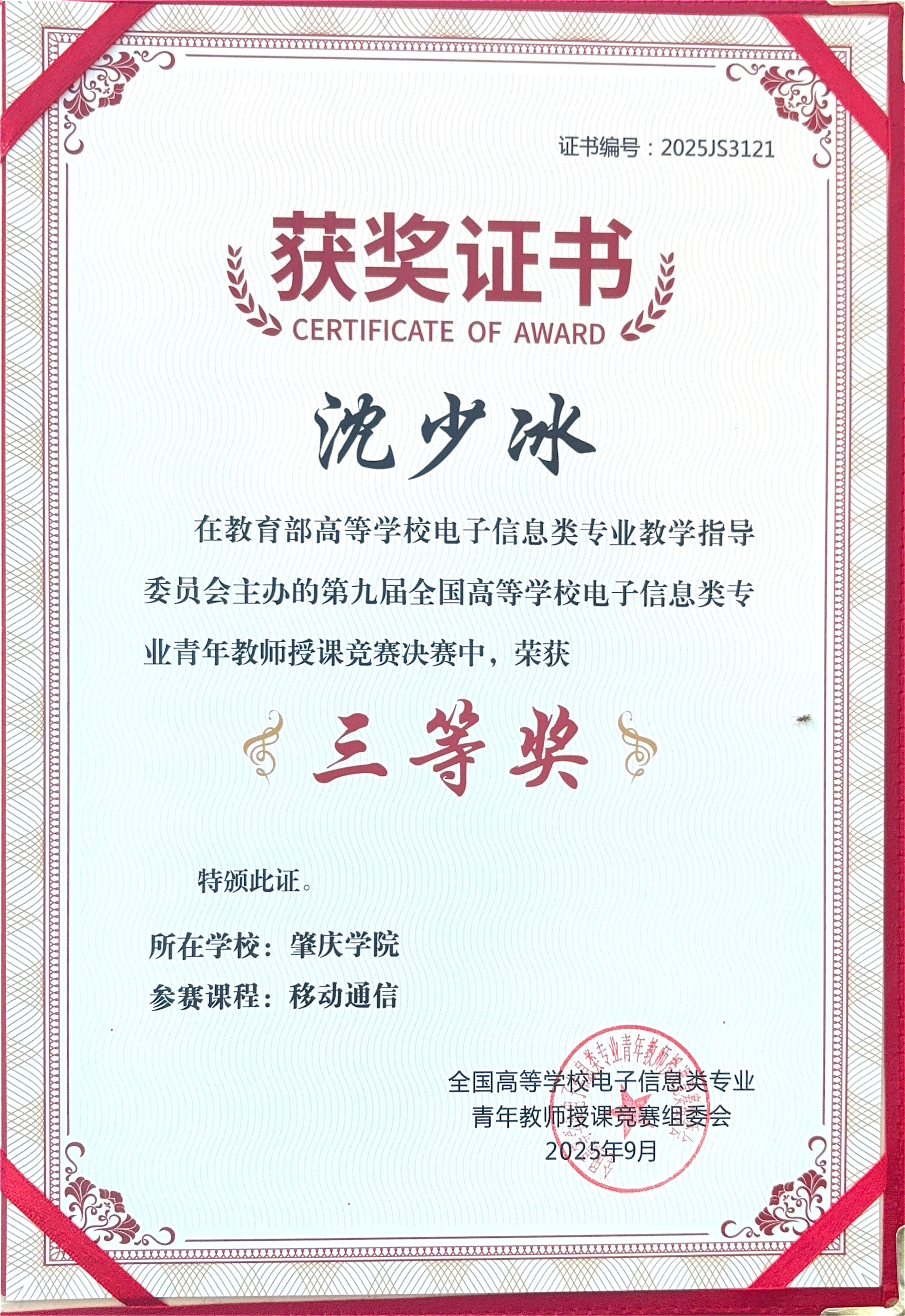 本网讯 9月19日-22日,由教育部高等学校电子信息类专业教学指导委员会主办的第九届全国高等学校电子信息类专业青年教师授课竞赛决赛在长春理工大学举行,英国365公司沈少冰老师荣获全国三等奖。