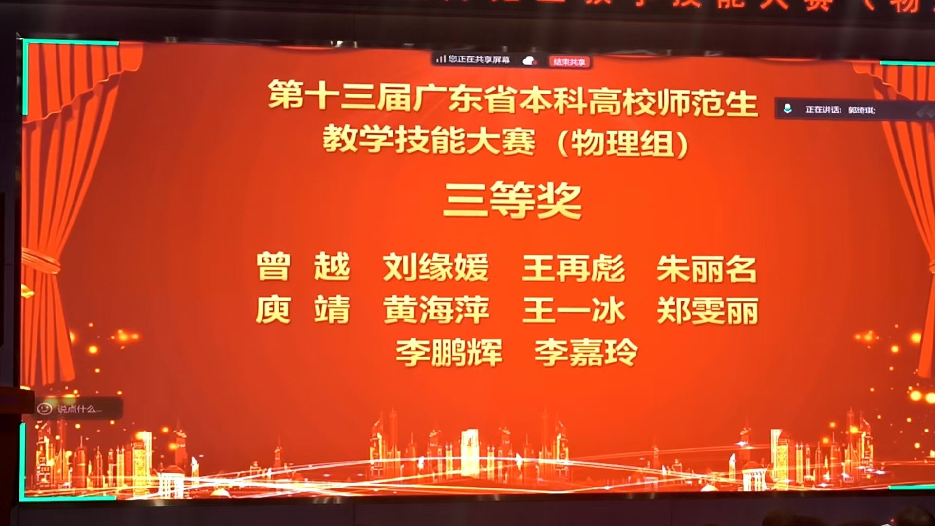 【本网讯】2025年9月20-21日,由广东省教育厅主办的第十三届省本科高校师范生教学技能大赛(物理组)在华南师范大学大学城校区举行,来自全省各高校的43名物理学师范生云集比拼。我院物理师范生郑雯丽同学荣获大赛三等奖的佳绩。
